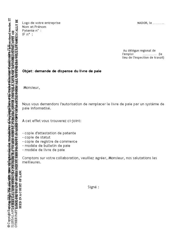 Demande De Dispense Du Livre De Paie
