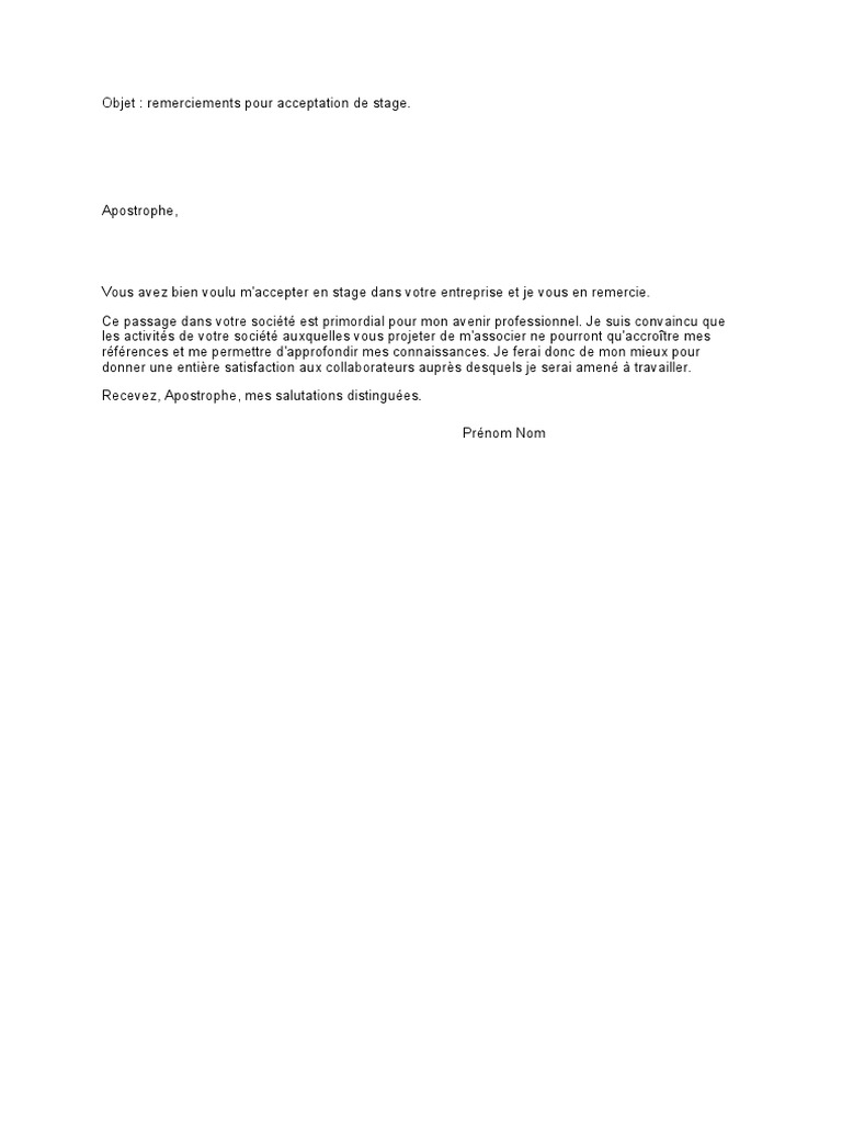 Pour les remerciements de stage la lettre reste le meilleur support pour sexprimer. Ainsi envoyer une lettre de remerciement après un stage scolaire est une bonne pratique qui mérite quon lapplique. Ce document est soumis au droit dauteur.