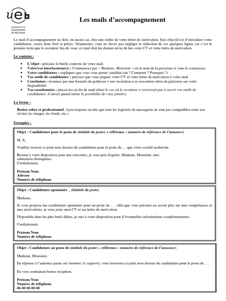 Mail accompagnant une candidature spontanée. Économisez du temps et des efforts et obtenez un résultat comme le modèle ci-dessous. Exemple de mail de candidature à une offre demploi. Vous trouverez ci-joints mon CV ainsi quune lettre de motivation plus détaillée.