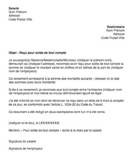 Modèle de reçu pour solde tout compte. Socest ce que je vais avoir le chèque du solde tout compte. Indiquez les coordonnées du destinataire. Le solde de tout compte doit être remis à la fin du contrat de travail CDI.
